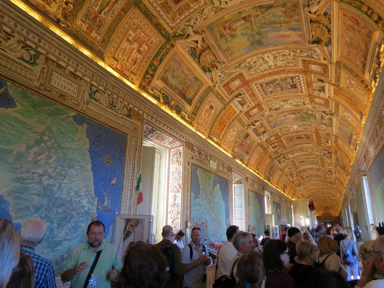 The Sistine Chapel is the climax of a somewhat long-winded tour of the rest of the Vatican Museum collection, so you have to pick and choose what you want to focus on as to not exhaust yourself before the big finale. I barely glanced at the Georgian Egyptian museum, and bypassed the tapestries fairly quickly. This is where I had to elbow my way past the tour groups, although it was nice to keep an ear out for an interesting tid bit I’d overhear from an English-speaking tour guide. I paid a bit more attention to the Gallery of Maps, where I saw one of Italy sans Sicily – Sicily was under Spanish rule at the time, so it got cut out of the map!